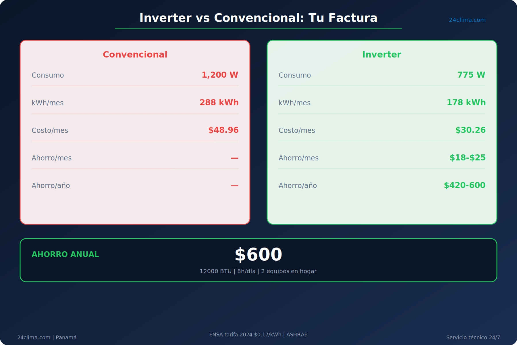 Con 8 horas de uso diario y la tarifa residencial de ENSA ($0.17/kWh en 2024), un inverter de 12000 BTU con SEER 20 consume aproximadamente 160 a 190 kWh al mes — entre $27 y $32 en tu factura. Un equipo convencional del mismo tamaño, en las mismas condiciones, sale entre $45 y $55 al mes.