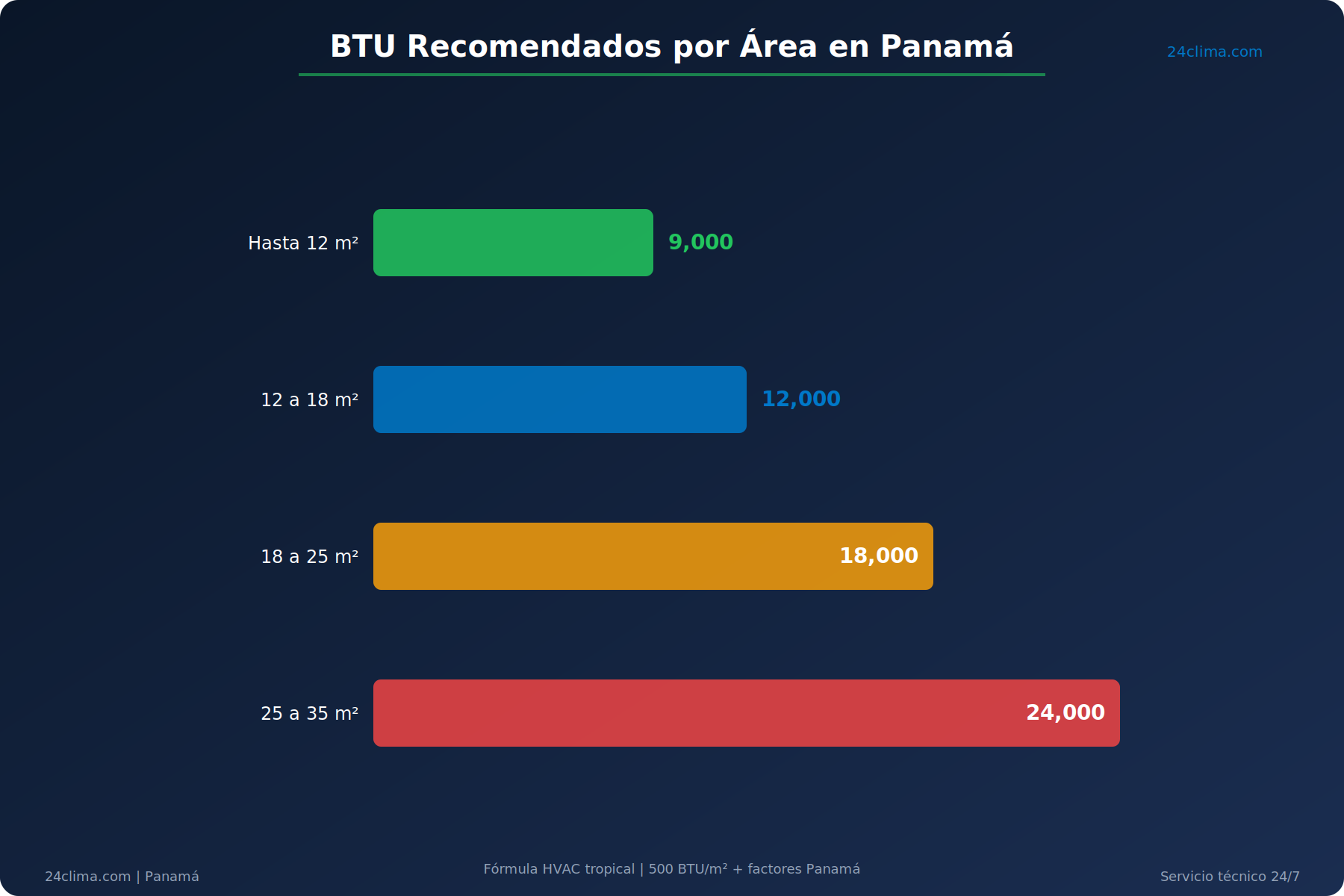 Área del cuarto — BTU recomendado — Nota Hasta 12 m² — 9000 BTU — Solo si hay poca exposición solar 12 a 18 m² — 12000 BTU — Capacidad estándar, la más versátil 18 a 25 m² — 18000 BTU — Para cuartos grandes o salas pequeñas 25 a 35 m² — 24000 BTU — Salas, oficinas o cuartos master con baño