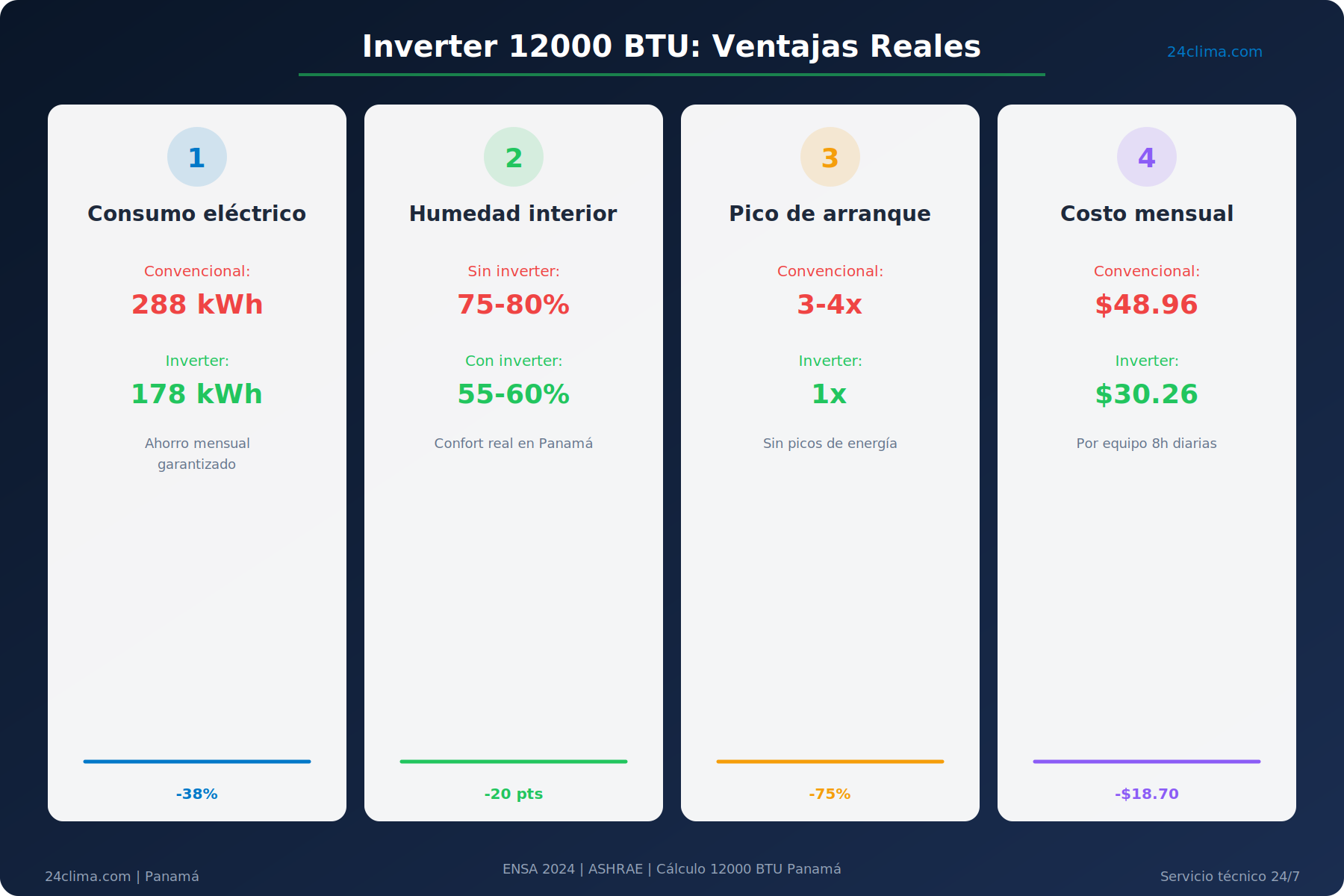 Volvemos al cuarto de Costa del Este. Esta vez, el inverter arranca suave, sin golpe de motor. En 15 minutos el cuarto está en 23°C y la humedad baja a 55%. La diferencia no es solo temperatura: es la forma en que respiras. La forma en que duermes. Y al mes siguiente, la factura de ENSA marca $28 en lugar de $52 para ese equipo.