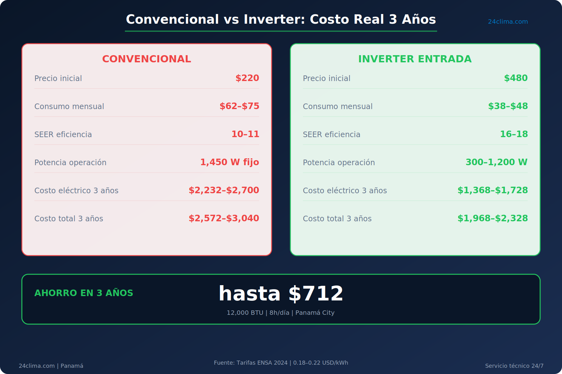 Equipo convencional económico — $220 precio inicial Potencia típica: 1,450 W en operación. Eficiencia: SEER 10 a 11, muy baja. A 8 horas diarias durante 30 días, el costo eléctrico oscila entre $62 y $75 al mes — entre $2,232 y $2,700 en tres años. Suma $120 de mantenimiento básico (dos limpiezas anuales) y el costo total ronda los $2,572 a $3,040.