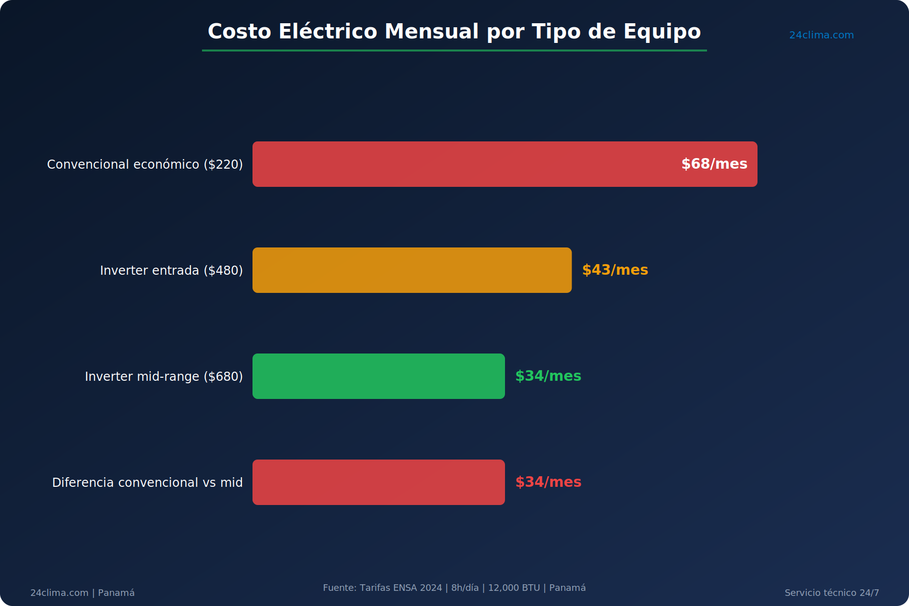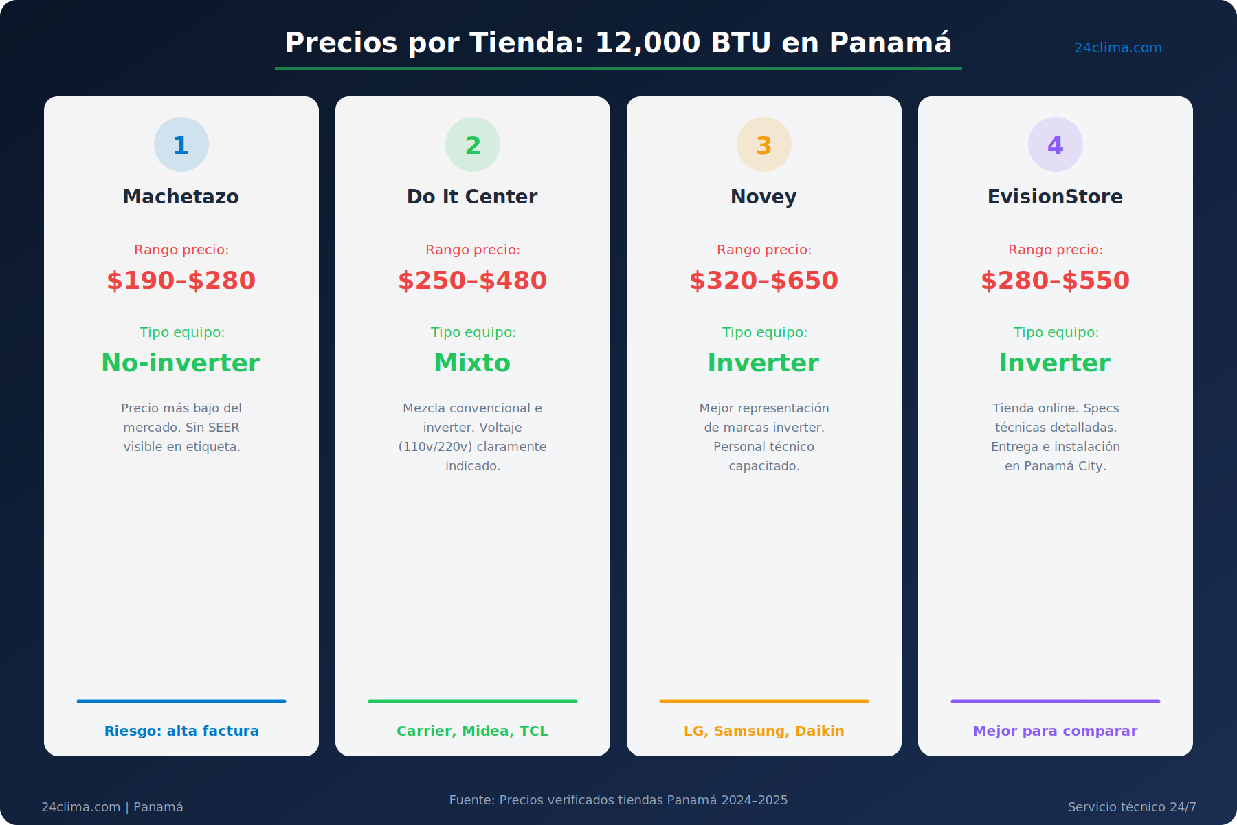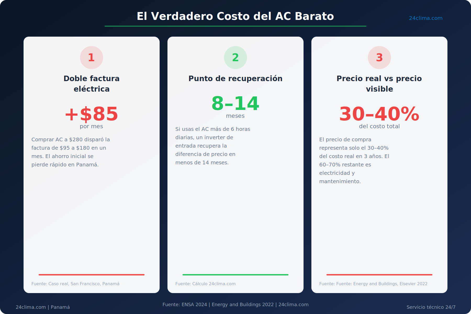 En nuestras guías y consejos de 24clima.com encontrarás información técnica calibrada para el clima panameño. Aquí vamos directo al grano: cuánto cuestan realmente los equipos, dónde comprarlos, qué esconde el precio bajo, y cómo calcular cuál opción te ahorra más dinero en 36 meses.
