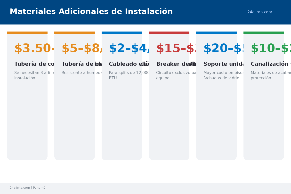 Nuestro servicio de instalación de aire acondicionado incluye todos los materiales listados, técnicos certificados y garantía sobre el trabajo realizado. Cubrimos Ciudad de Panamá y sus alrededores — revisa nuestras áreas de servicio en 24clima.com/areas-de-servicio/.