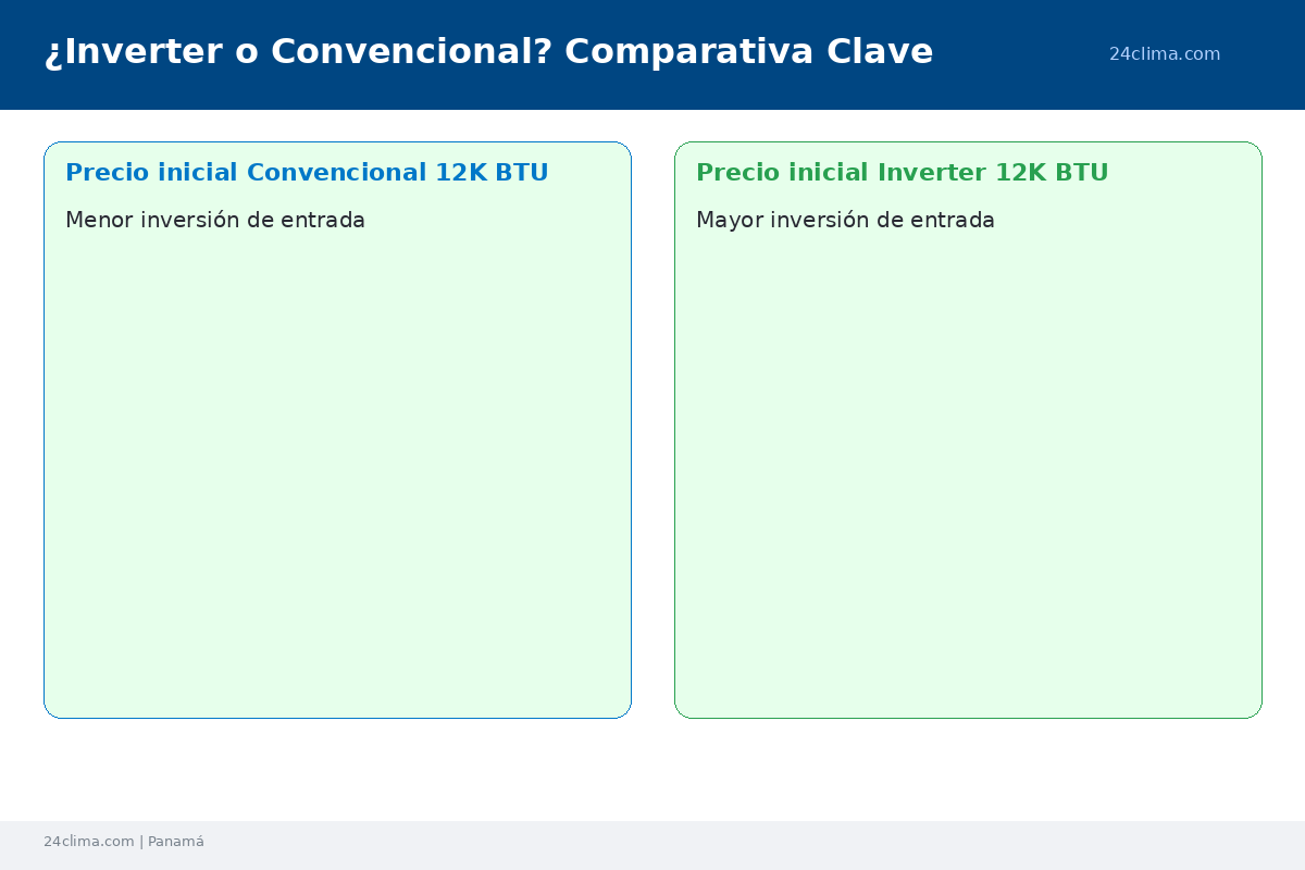 La diferencia entre inverter y no inverter no es solo de precio inicial. Un equipo inverter en Panamá, donde el AC corre prácticamente sin parar durante 10 o más meses al año, puede traducirse en un ahorro de $25 a $60 mensuales en electricidad según el tamaño. En tres años, esa diferencia generalmente supera el sobreprecio del equipo.