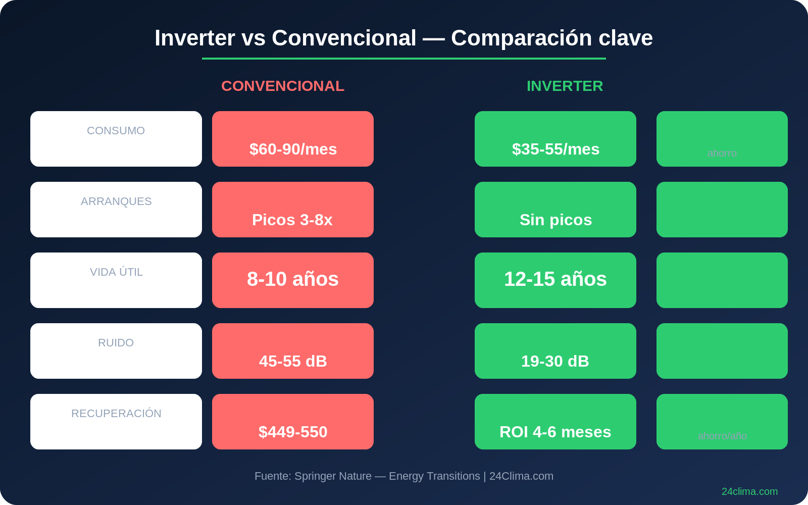 Según un estudio publicado por Springer Nature, un inverter consume hasta un 44% menos electricidad que un convencional en condiciones de uso continuo. En climas tropicales como el nuestro, el ahorro oscila entre 30% y 50%.