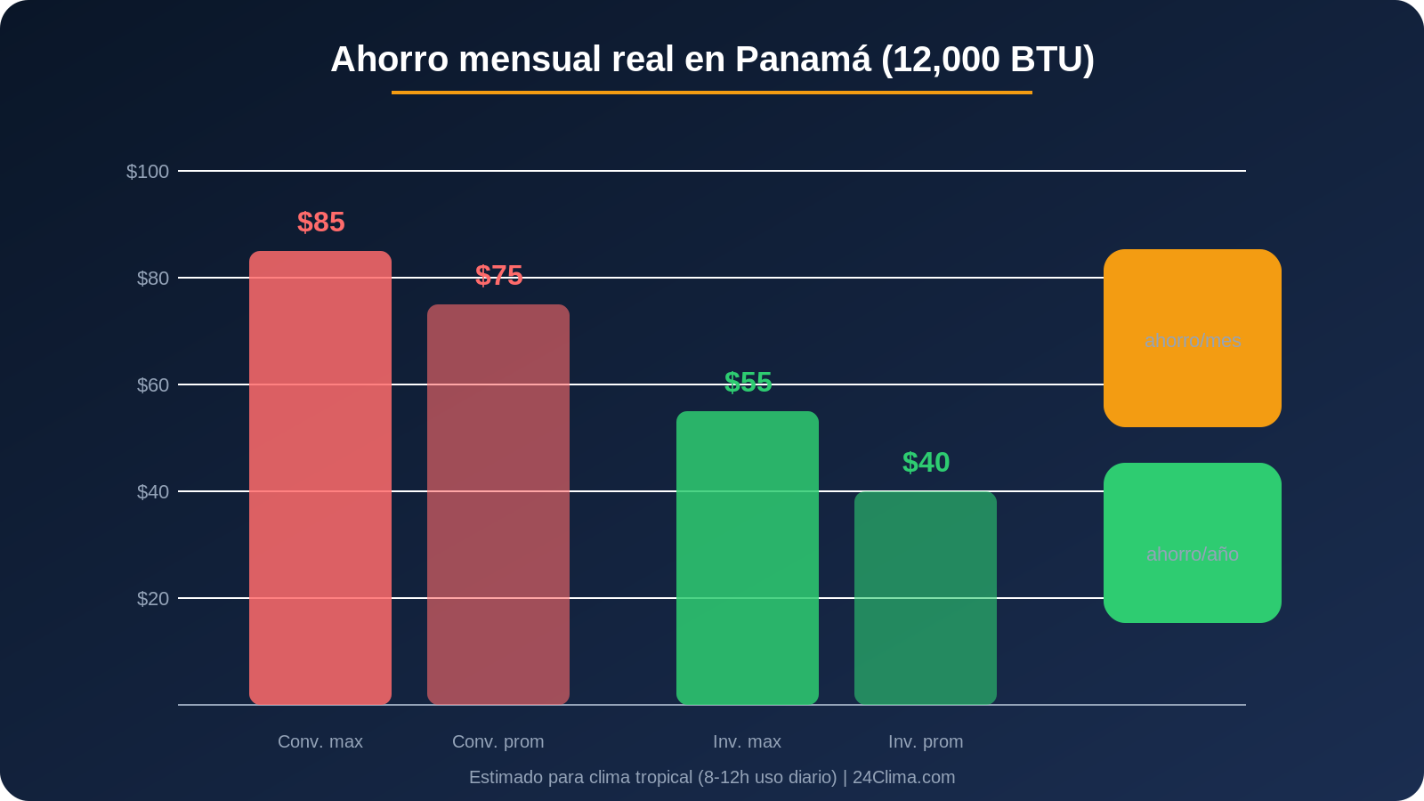 — Un aire convencional de 12,000 BTU puede costar entre $60 y $90 al mes en electricidad — Un inverter del mismo tamaño: entre $35 y $55 — Ahorro mensual promedio: $25 a $35 — Ahorro anual: $300 a $420